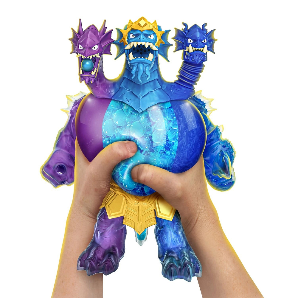 Погрузись в Морскую бездну вместе с новыми Гуджитсу Дип Гу-Сиа! В глубины океана тебя вызывает Царь Гидра - Правитель Морской Бездны, самый могущественный герой во Вселенной! Найдется герой или монстр способный одолеть Царя? Морская бездна - утроенный стиль Гу! Океан уникальных Гу-Атак и Гу-наполнений. Нет другого такого героя: все злодеи дрожат от одной мысли о нем. Он единственный, кто смог постичь стиль Тройной Атаки! Фиолетовая голова запускает Взрывную Атаку, выпуская снаряд изо рта. Синяя голова, используя силу Растяжения, вытягивается на своей гибкой шее, чтобы добраться до монстров. А его мощная голубая голова с Оглушительным Рыком (35 звуков) идет в атаку Боевыми Челюстями, заставляя его сердце светиться! Он может растягиваться в 3 раза и легко принимать свою первоначальную форму. Морская бездна наградила Гидру уникальным тройным Гу-наполнением.